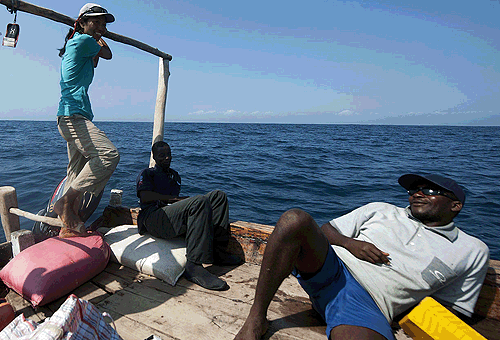 Nästa morgon, den 5:e augusti, gick vi upp innan soluppgången och gjorde oss klara att ge oss ut på vattnet. Vi vadade ut med utrustningen till en Dhow som låg förankrad en bit ut i vattnet. En Dhow är en segelbåt av trä i traditionell stil som troligen har sitt ursprung i arabvärlden. Segelbåten ser nog mer eller mindre precis ut som de har gjorde i flera hundra år förutom möjligtvis nylonrepen och det faktum att det sitter en utombordare i bak. Vi hade inte åkt långt förrän vi hittade en grupp delfiner som jagades av flera båtar med turister som ville snorkla med dem. Vi tog en del identifikationsbilder på delfinernas ryggfenor innan vi fortsatte längre ut på havet för att leta efter valar. När vindriktningen tillät hissade vi segel för att spara bränsle. När seglet väl var uppe blev det lugnt och skönt då vi åkte med vinden och motorn var avstängd.
